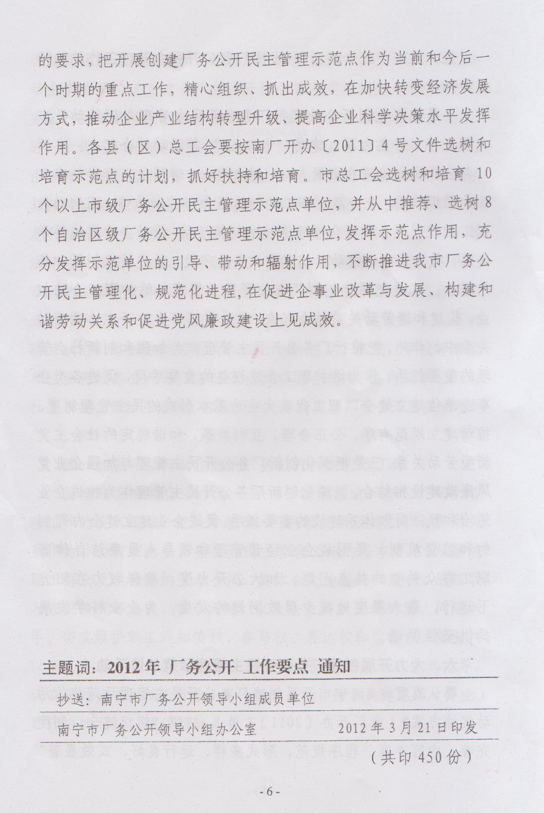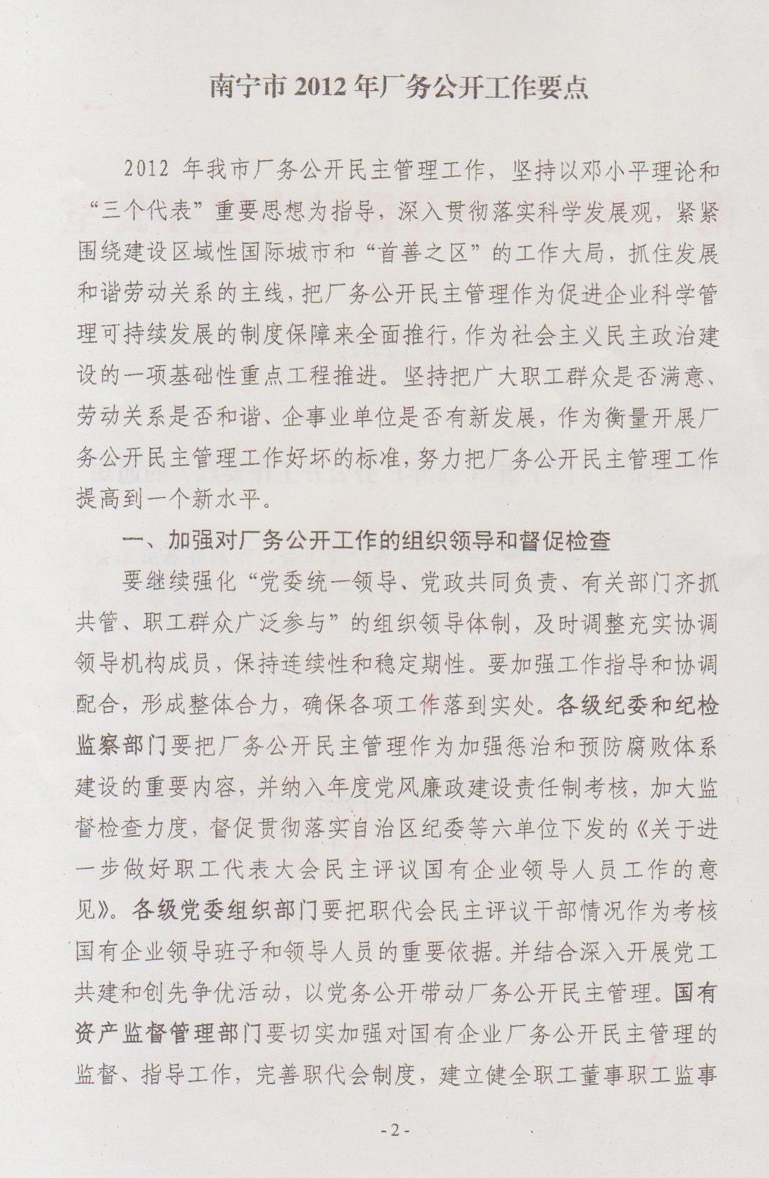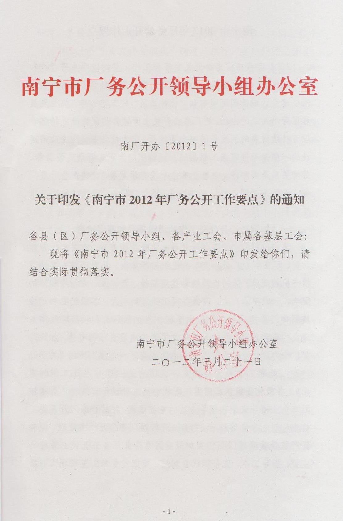 關(guān)于印發(fā)《南寧市2012年廠(chǎng)務(wù)公開(kāi)工作要點(diǎn)》的通知(南廠(chǎng)開(kāi)辦[2012]1號)